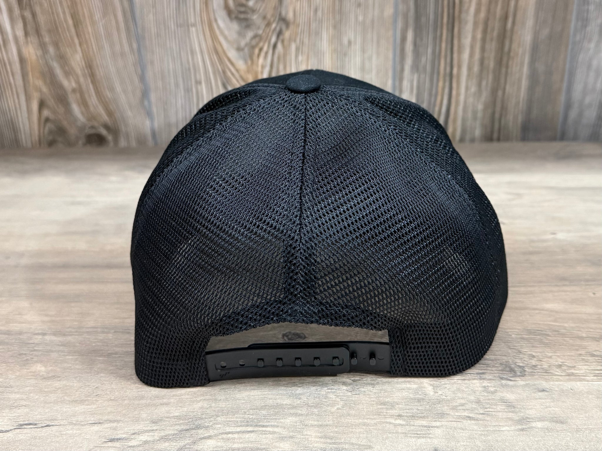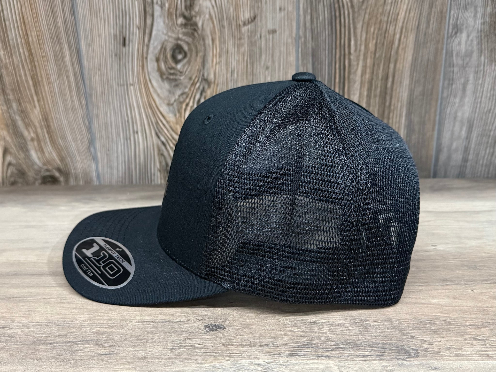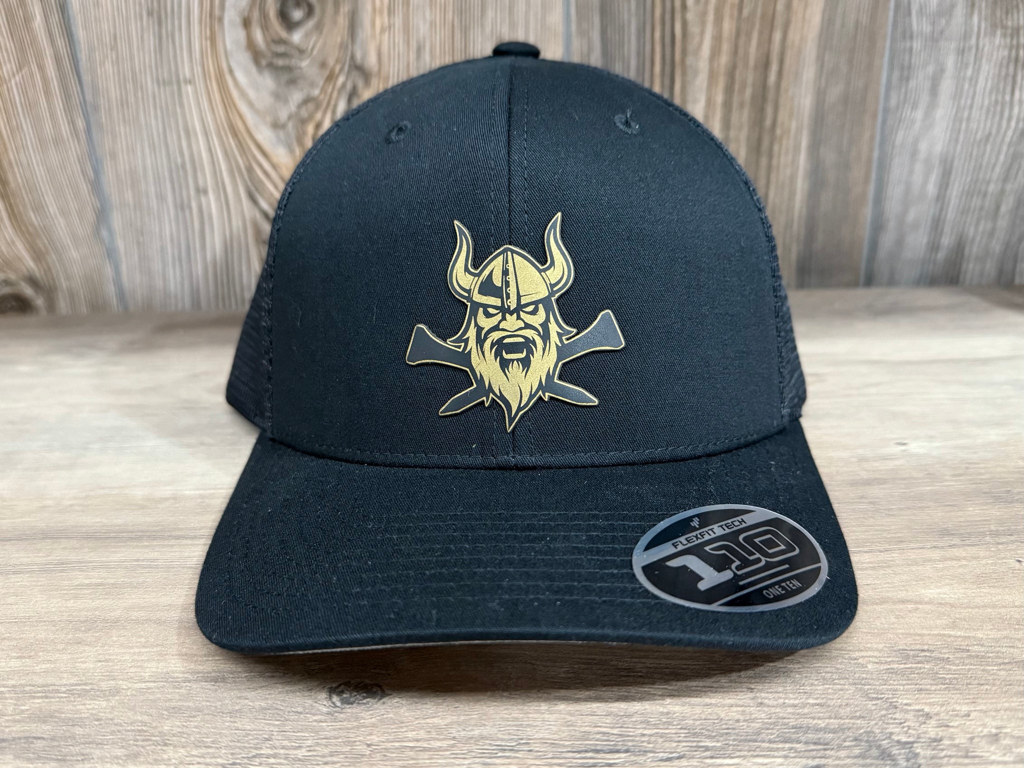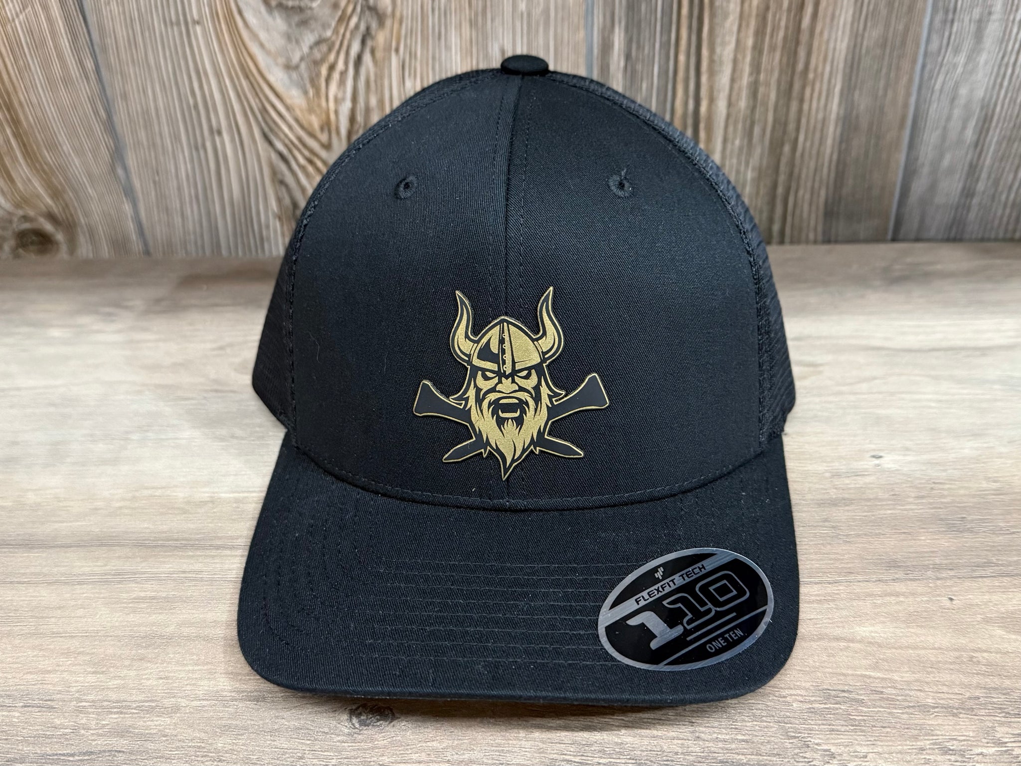 Black Trucker cap with Golden Viking and Teebones. One size fits most and 110 Flexfit for best comfort.
